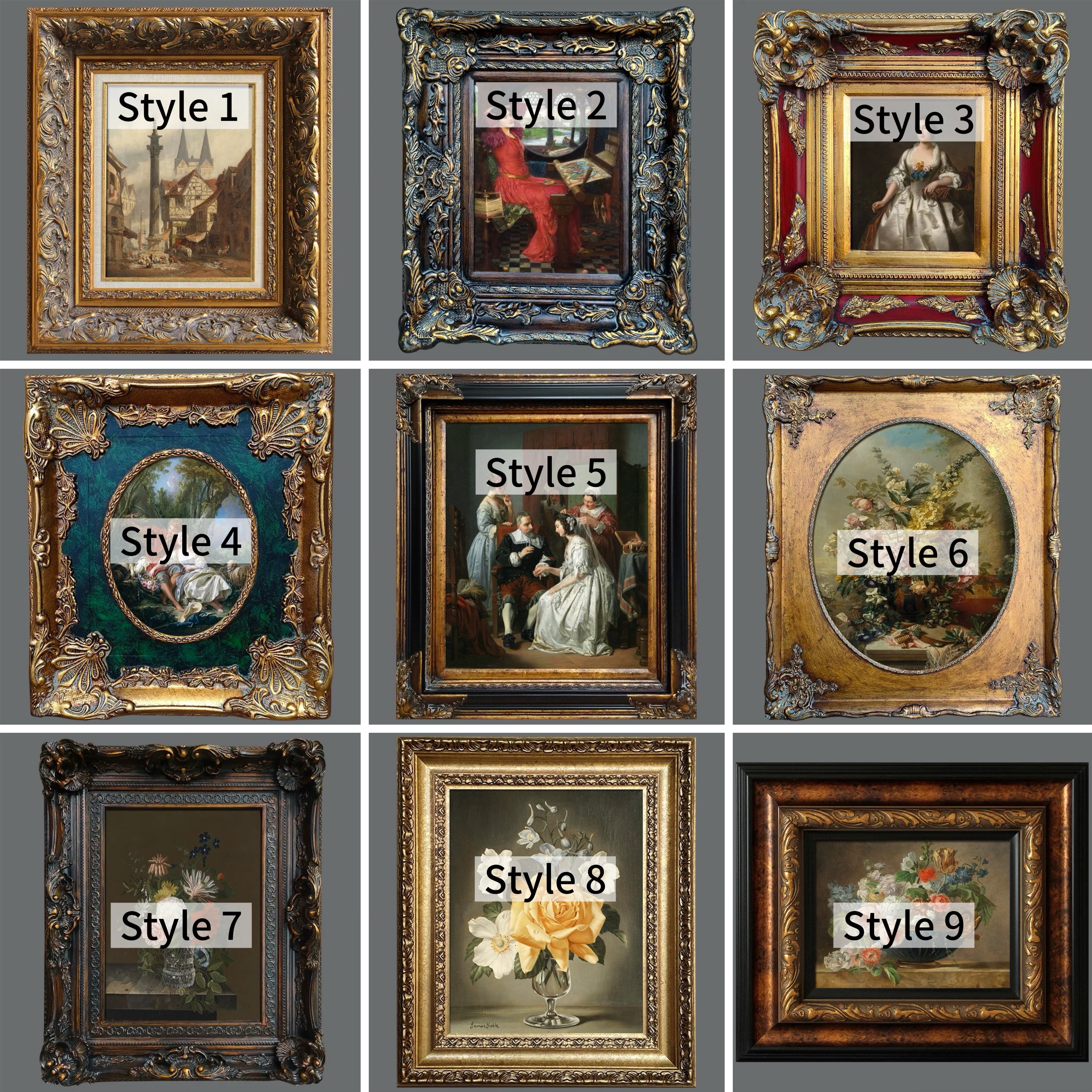 A perfect custom hand-painted oil painting deserves a high-quality frame to enhance its artistry and preserve its timeless charm. Our framing options are meticulously crafted to complement your personalized portrait, pet painting, couple artwork, family keepsake, collage, or decorative piece—seamlessly blending with your home decor while highlighting the unique brushstrokes and vivid colors of your hand-painted creation. We offer 3 premium standard frame styles, plus fully personalized framing customization, so you can find or create the perfect frame to match your vision.